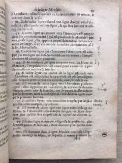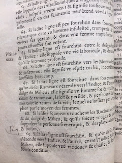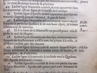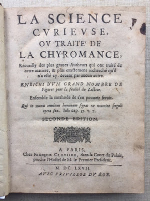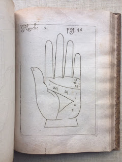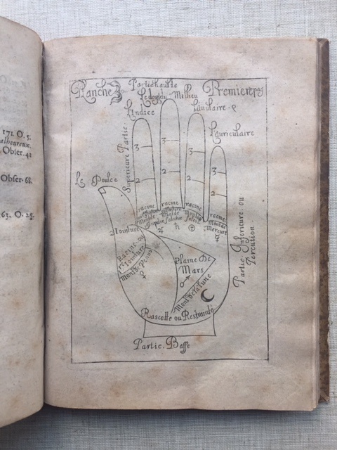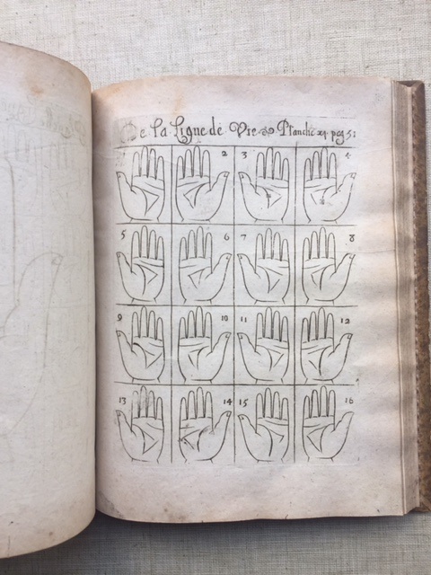 “Cet ouvrage, l'un des meilleurs traités de chiromancie du XVIIème siècle, qui porte en épigraphe les paroles du patriarche Job: "qui in manu omnium hominum signat ut nouerint singuli opera sua", est accompagné de 90 planches gravées dont une récapitulative des lignes de la main, les autres représentant au total 1224 paumes." (Dorbon 4479).